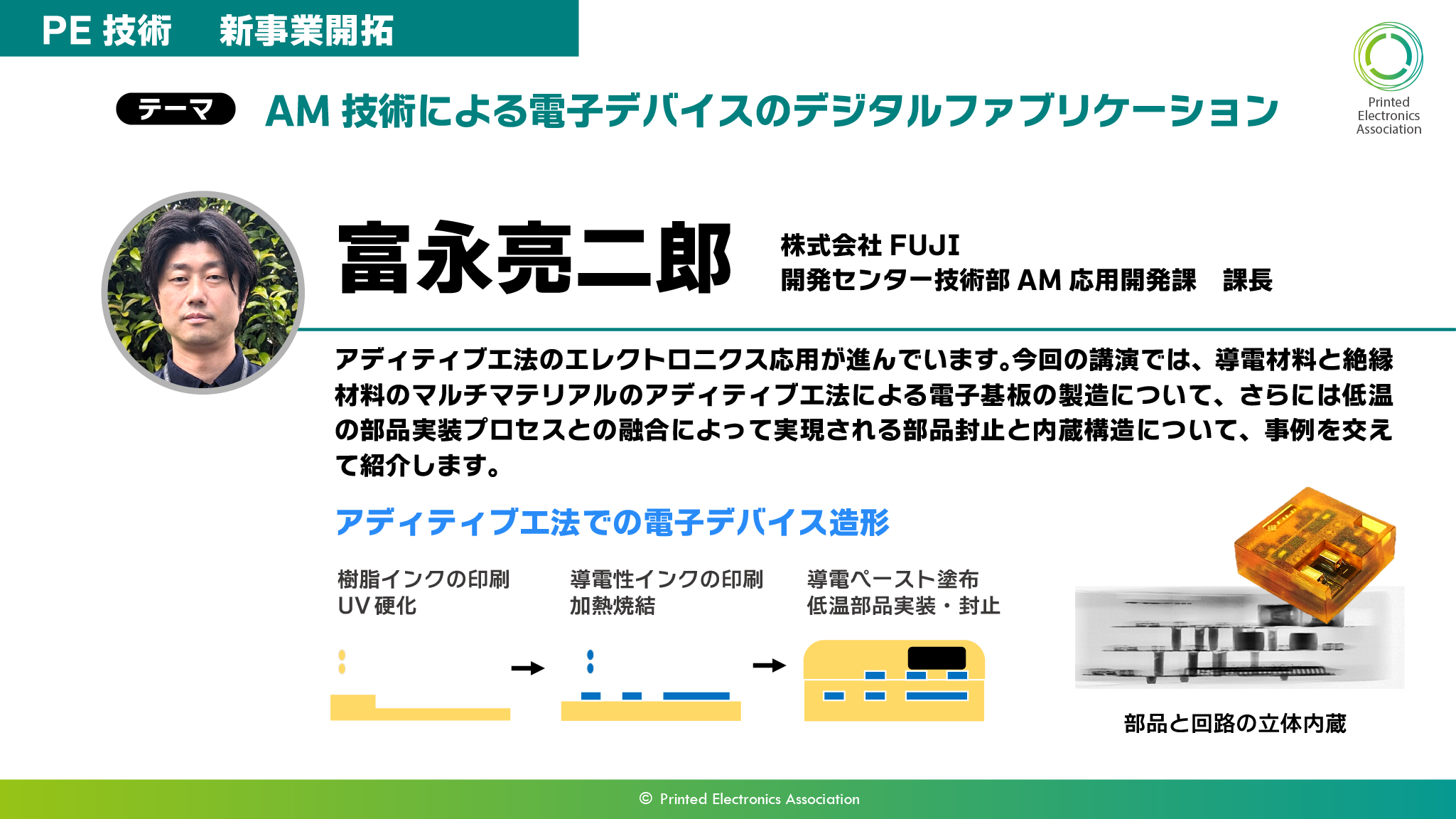 15:30-16:30 | 『AM技術による電子デバイスのデジタルファブリケーション』 | 株式会社FUJI 開発センター技術部AM応用開発課 課長 富永亮二郎 |