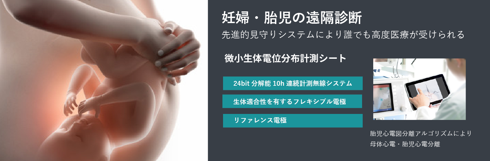 妊婦の子宮の収縮状態や胎児の心電図などのデータを遠隔で確認・診断できる新システム。妊婦の腹部に小型センサーを貼るだけで、センサーに搭載した人工知能(AI)が一日中情報収集し、スマートフォンなどを介して医療機関へ送信。通院しなくても、産婦人科医が胎児の健康状態を把握したり、陣痛を診断したりできる。平成34年をめどに実用化を目指します。